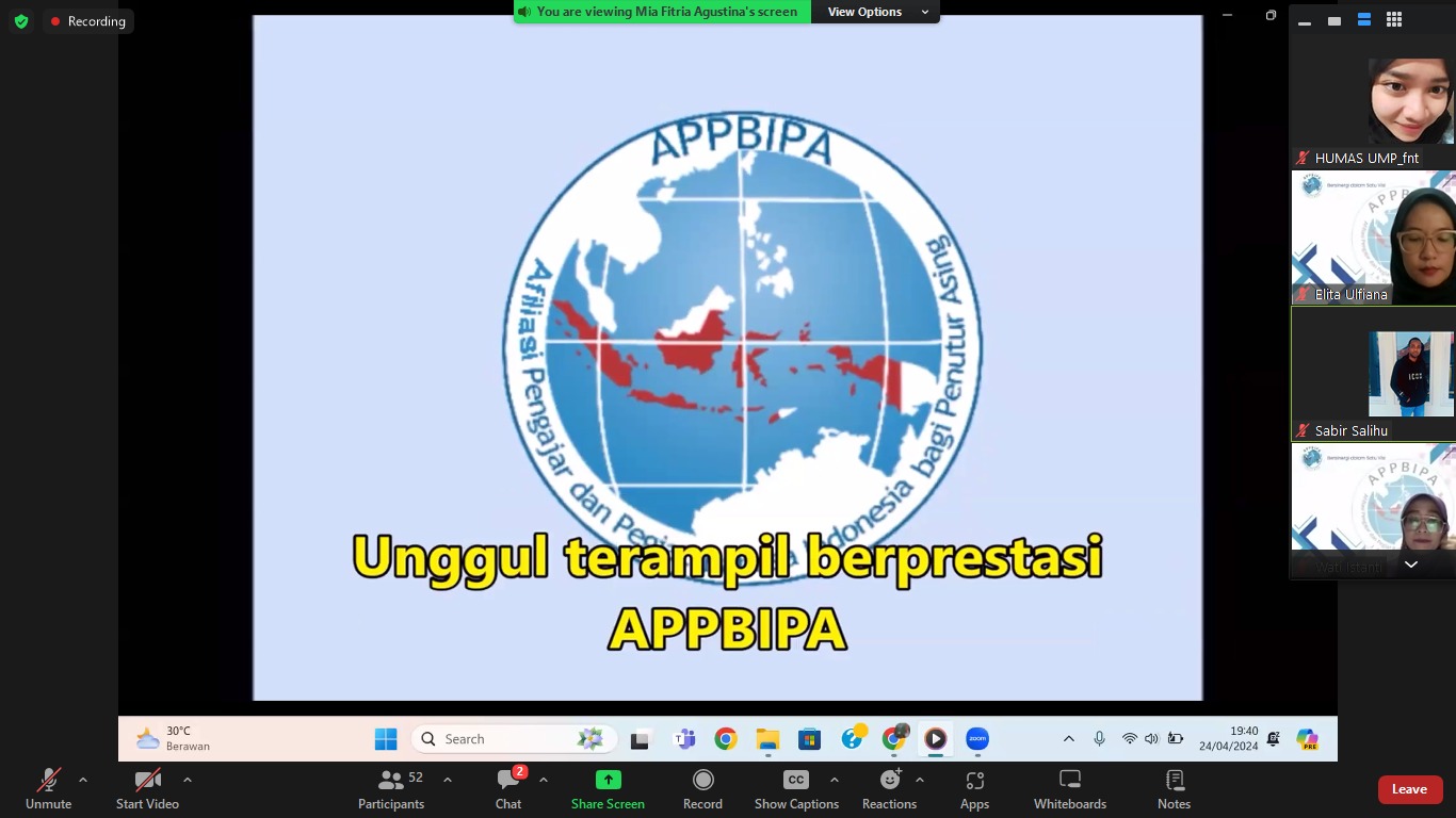 Afiliasi Pengajar dan Pegiat Bahasa Indonesia bagi Penutur Asing (APPBIPA) Jawa Tengah menggelar acara Bincang BIPA #2 bertajuk ‘BIPA DAN TATA BAHASA’, yang diadakan pada Rabu (24/04/2024) malam.